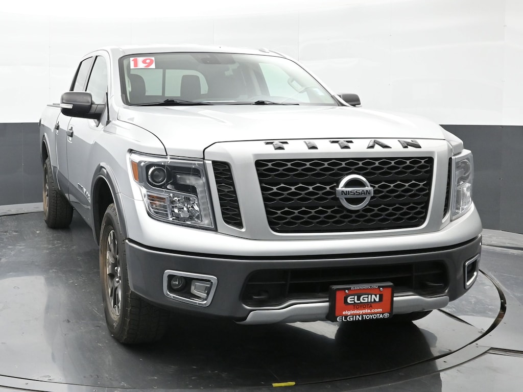 Conquer the road and trail with confidence in this 2019 Nissan Titan PRO-4X 4x4 Crew Cab. Finished in Brilliant Silver with a bold black interior, this rugged full-size truck is built for those who demand both power and off-road capability. Under the hood, the Titans robust V8 engine delivers impressive towing capacity and confident performance, while the PRO-4X off-road suspension, skid plates, and electronic locking rear differential ensure youre ready for any adventure.